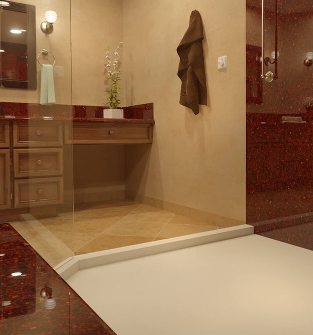 We make your showers more beautiful with walls that go right to the floor every time - get rid of the "tray look" with flanges around the perimeter. Above you see a shower wall cutaway with Durock® resting atop a hidden water flange. These flanges go behind the wall giving your shower a tighter modern look.